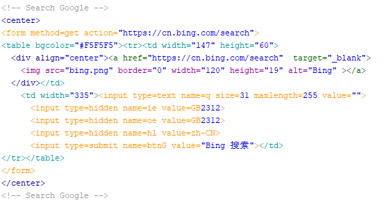 【网页技术】如何制作网页Bing 搜索框 2022年1月5日 by 简慢·0 Comments 因网上无现成的bing搜索框源码,小编借用google搜索框源码,修改参数,获得完美的bing搜索框效果(见上图),源代码见下图,供大家参考。 ~谢谢您的微信打赏~ 赏